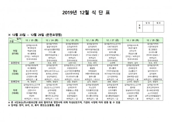 12월 넷째주 식단표 페이지 정보 작성자 은천노인복지회 작성일19-12-30 14:32 조회189,021회 댓글0건 관련링크 이전글 다음글 목록 답변 본문 12월 넷째주 식단표입니다 이전글 다음글 목록 답변