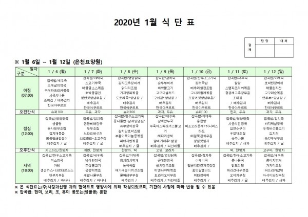 1월 첫째주 식단표 페이지 정보 작성자 은천노인복지회 작성일20-01-13 10:55 조회187,461회 댓글0건 관련링크 이전글 다음글 목록 답변 본문 1월 첫째주 식단표입니다. 이전글 다음글 목록 답변