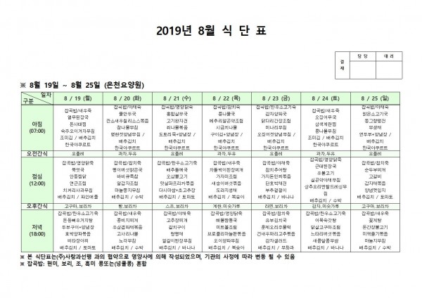 8월 넷째주 식단표 페이지 정보 작성자 은천노인복지회 작성일19-08-26 16:38 조회196,184회 댓글0건 관련링크 이전글 다음글 목록 답변 본문 8월 넷째주 식단표 이전글 다음글 목록 답변