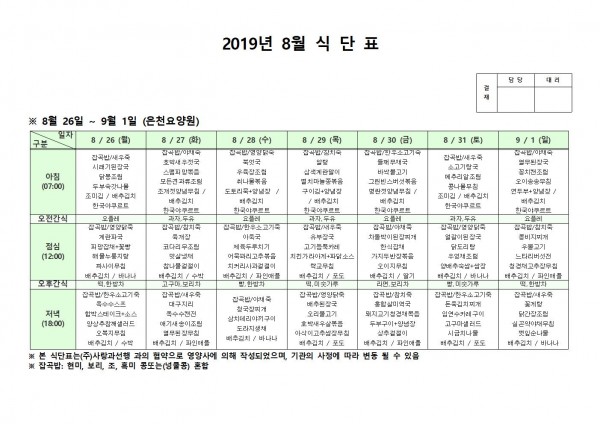8월 다섯째주 식단표 페이지 정보 작성자 은천노인복지회 작성일19-09-04 17:29 조회197,625회 댓글0건 관련링크 이전글 다음글 목록 답변 본문 8월 다섯째주 식단표 이전글 다음글 목록 답변