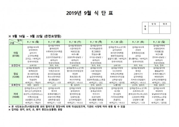 9월 셋째주 식단표 페이지 정보 작성자 은천노인복지회 작성일19-09-23 13:27 조회196,511회 댓글0건 관련링크 이전글 다음글 목록 답변 본문 . 이전글 다음글 목록 답변