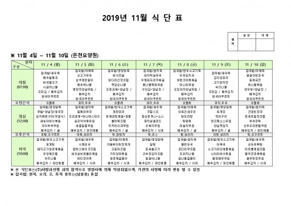 11월 첫째주 식단표 페이지 정보 작성자 은천노인복지회 작성일19-11-12 14:17 조회193,221회 댓글0건 관련링크 이전글 다음글 목록 답변 본문 11월 첫째주 식단표 이전글 다음글 목록 답변
