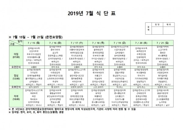 7월 셋째주 식단표 페이지 정보 작성자 은천노인복지회 작성일19-07-22 11:09 조회199,442회 댓글0건 관련링크 이전글 다음글 목록 답변 본문 7월 셋째주 식단표 이전글 다음글 목록 답변