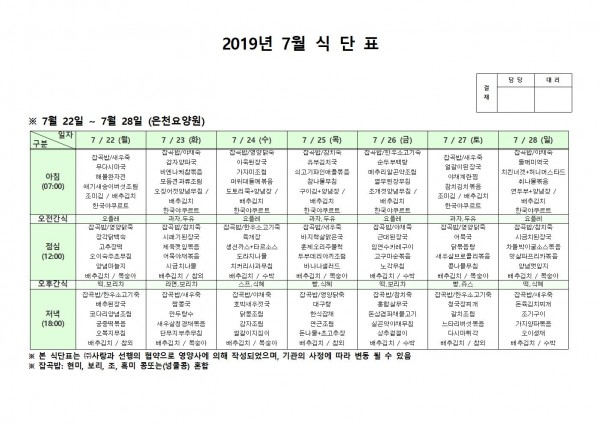 7월 넷째주 식단표 페이지 정보 작성자 은천노인복지회 작성일19-07-29 13:58 조회198,664회 댓글0건 관련링크 이전글 다음글 목록 답변 본문 7월 넷째주 식단표 이전글 다음글 목록 답변