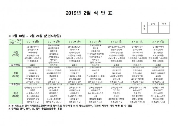 2월 셋째주 식단표 페이지 정보 작성자 은천노인복지회 작성일19-02-28 15:44 조회207,573회 댓글0건 관련링크 이전글 다음글 목록 답변 본문 2월 셋째주 식단표 이전글 다음글 목록 답변