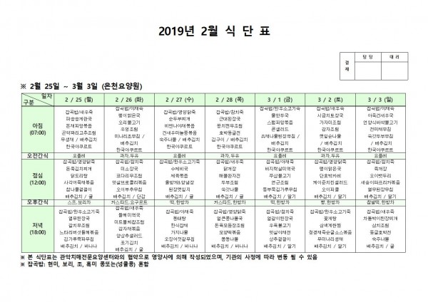 2월 넷째주 식단표 페이지 정보 작성자 은천노인복지회 작성일19-03-04 15:48 조회206,952회 댓글0건 관련링크 이전글 다음글 목록 답변 본문 2월 넷째주 식단표 이전글 다음글 목록 답변