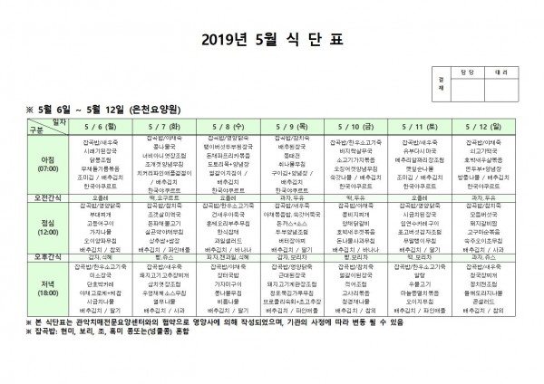 5월 첫째주 식단표 페이지 정보 작성자 은천노인복지회 작성일19-05-13 13:11 조회204,156회 댓글0건 관련링크 이전글 다음글 목록 답변 본문 5월 첫째주 식단표 이전글 다음글 목록 답변