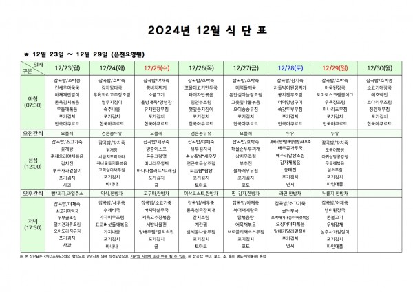 12월 넷째주 식단표 페이지 정보 작성자 은천노인복지회 작성일24-12-23 16:39 조회19,529회 댓글0건 관련링크 이전글 다음글 목록 답변 본문 . 이전글 다음글 목록 답변