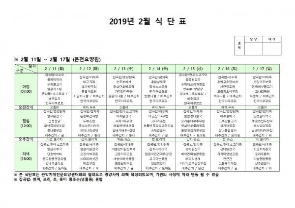 2월 둘째주 식단표 페이지 정보 작성자 은천노인복지회 작성일19-02-13 17:30 조회208,307회 댓글0건 관련링크 이전글 다음글 목록 답변 본문 2월 둘째주 식단표 이전글 다음글 목록 답변