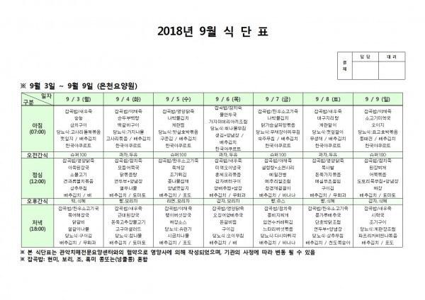 9월 첫째주 식단표 페이지 정보 작성자 은천노인복지회 작성일18-09-11 09:27 조회207,545회 댓글0건 관련링크 이전글 다음글 목록 답변 본문 9월 첫째주 식단표 이전글 다음글 목록 답변