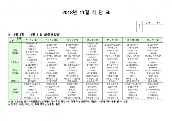 11월 1주째 식단표 페이지 정보 작성자 은천노인복지회 작성일18-12-07 09:37 조회208,826회 댓글0건 관련링크 이전글 다음글 목록 답변 본문 11월 1주째 식단표 이전글 다음글 목록 답변