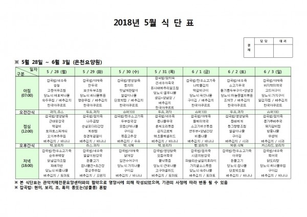 5월 다섯째주 식단표 페이지 정보 작성자 은천노인복지회 작성일18-06-07 10:39 조회207,998회 댓글0건 관련링크 이전글 다음글 목록 답변 본문 5월 다섯쨰주 식단표 이전글 다음글 목록 답변