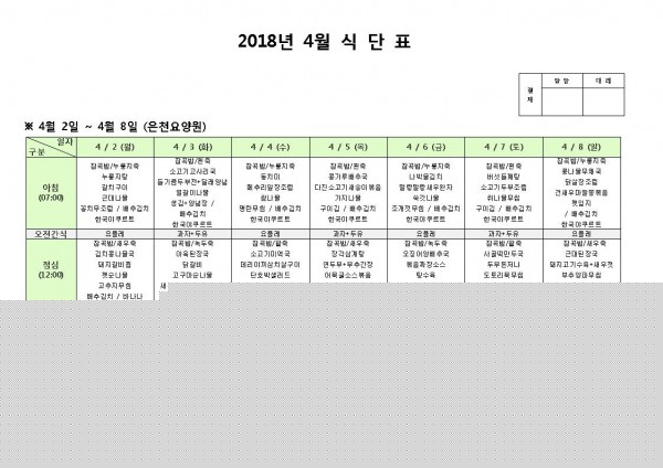 4월 첫째주 식단표 페이지 정보 작성자 은천노인복지회 작성일18-04-02 15:32 조회201,103회 댓글0건 관련링크 이전글 다음글 목록 답변 본문 4월 첫째주 식단표 이전글 다음글 목록 답변