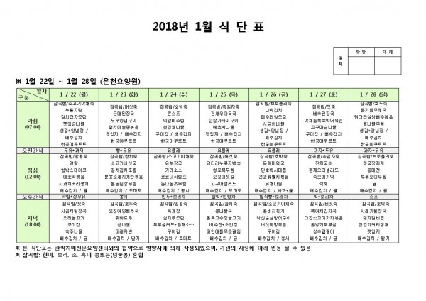 1월 넷째주 식단표 페이지 정보 작성자 은천노인복지회 작성일18-01-24 11:07 조회196,478회 댓글0건 관련링크 이전글 다음글 목록 답변 본문 1월 넷째주 식단표 이전글 다음글 목록 답변