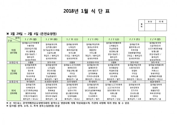 1월 다섯째주 식단표 페이지 정보 작성자 은천노인복지회 작성일18-01-31 13:35 조회195,987회 댓글0건 관련링크 이전글 다음글 목록 답변 본문 1월 다섯째주 식단표 이전글 다음글 목록 답변