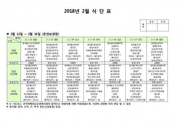 2월 둘째주 식단표 페이지 정보 작성자 은천노인복지회 작성일18-02-12 11:15 조회196,578회 댓글0건 관련링크 이전글 다음글 목록 답변 본문 2월 둘째주 식단표 이전글 다음글 목록 답변