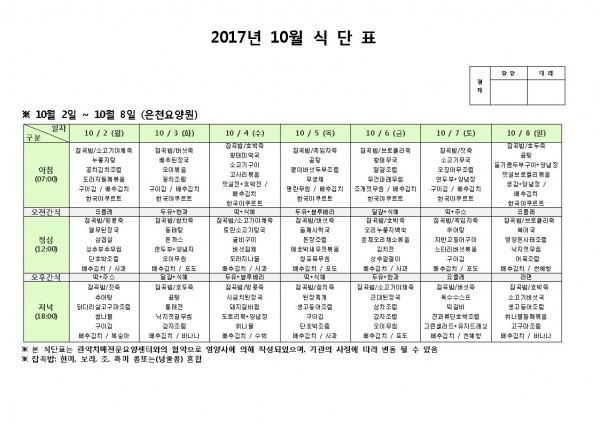 10월 첫째주 식단표 페이지 정보 작성자 은천노인복지회 작성일17-10-11 10:52 조회184,968회 댓글0건 관련링크 이전글 다음글 목록 답변 본문 10월 첫째주 식단표 이전글 다음글 목록 답변