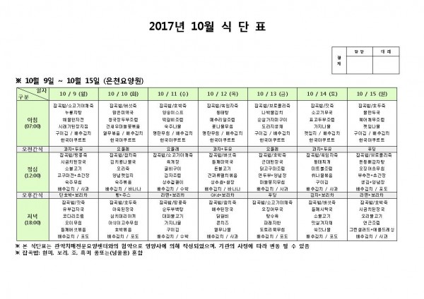 10월 둘째주 식단표 페이지 정보 작성자 은천노인복지회 작성일17-10-17 17:39 조회186,297회 댓글0건 관련링크 이전글 다음글 목록 답변 본문 10월 둘째주 식단표 이전글 다음글 목록 답변