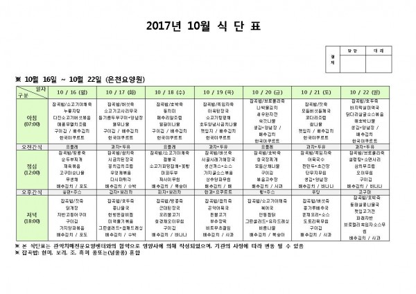 10월 셋째주 식단표 페이지 정보 작성자 은천노인복지회 작성일17-10-17 17:39 조회186,031회 댓글0건 관련링크 이전글 다음글 목록 답변 본문 10월 셋째주 식단표 이전글 다음글 목록 답변