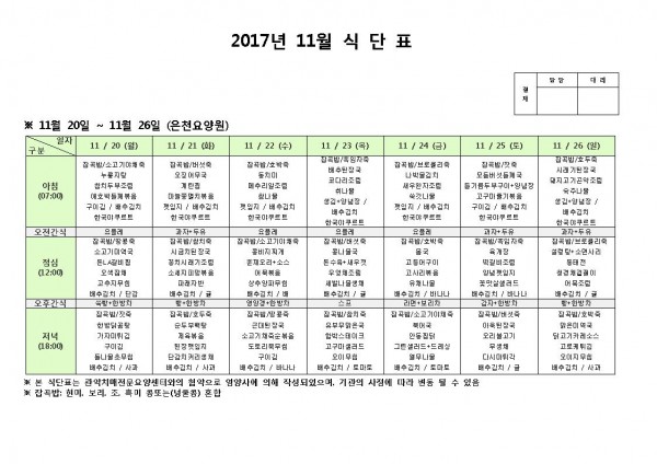 11월 넷째주 식단표 페이지 정보 작성자 은천노인복지회 작성일17-11-20 11:22 조회189,030회 댓글0건 관련링크 이전글 다음글 목록 답변 본문 11월 넷째주 식단표 이전글 다음글 목록 답변