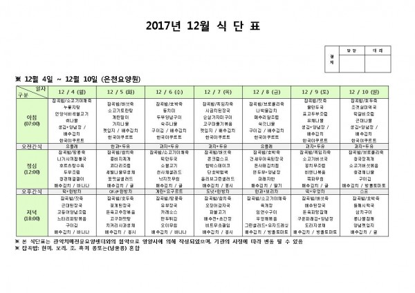 12월 둘째주 식단표 페이지 정보 작성자 은천노인복지회 작성일17-12-04 13:47 조회190,494회 댓글0건 관련링크 이전글 다음글 목록 답변 본문 12월 둘째주 식단표 이전글 다음글 목록 답변