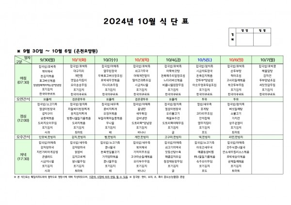 10월 첫째주 식단표 페이지 정보 작성자 은천노인복지회 작성일24-09-27 17:45 조회22,564회 댓글0건 관련링크 이전글 다음글 목록 답변 본문 . 이전글 다음글 목록 답변