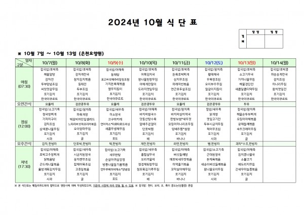 10월 둘째주 식단표 페이지 정보 작성자 은천노인복지회 작성일24-10-04 11:48 조회22,633회 댓글0건 관련링크 이전글 다음글 목록 답변 본문 . 이전글 다음글 목록 답변
