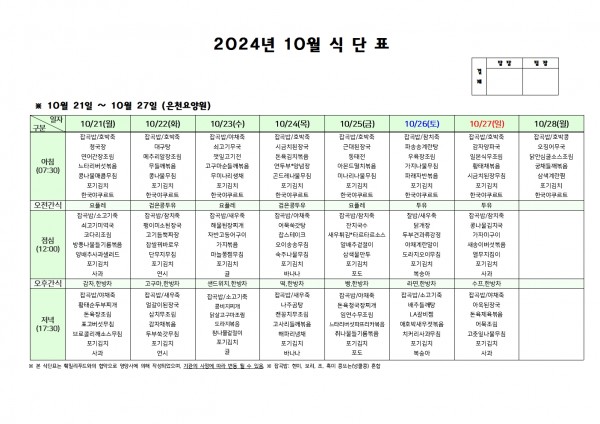 10월 넷째주 식단표 페이지 정보 작성자 은천노인복지회 작성일24-10-18 10:37 조회21,999회 댓글0건 관련링크 이전글 다음글 목록 답변 본문 . 이전글 다음글 목록 답변