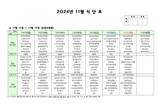 11월 둘째주 식단표 페이지 정보 작성자 은천노인복지회 작성일24-11-07 16:50 조회21,813회 댓글0건 관련링크 이전글 다음글 목록 답변 본문 . 이전글 다음글 목록 답변