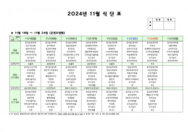 11월 셋째주 식단표 페이지 정보 작성자 은천노인복지회 작성일24-11-15 09:26 조회21,637회 댓글0건 관련링크 이전글 다음글 목록 답변 본문 . 이전글 다음글 목록 답변