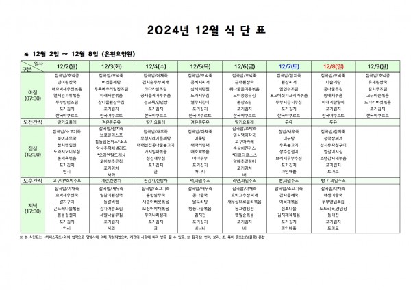 12월 첫째주 식단표 페이지 정보 작성자 은천노인복지회 작성일24-11-29 16:53 조회21,042회 댓글0건 관련링크 이전글 다음글 목록 답변 본문 . 이전글 다음글 목록 답변