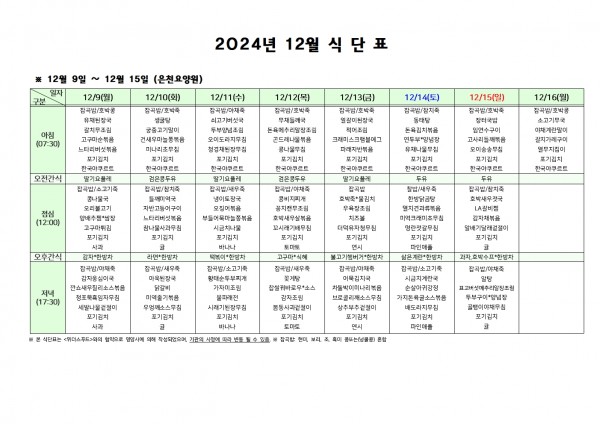 12월 둘째주 식단표 페이지 정보 작성자 은천노인복지회 작성일24-12-06 09:42 조회21,001회 댓글0건 관련링크 이전글 다음글 목록 답변 본문 . 이전글 다음글 목록 답변