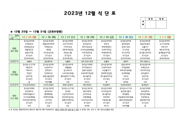 12월 다섯째주 식단표 페이지 정보 작성자 은천노인복지회 작성일23-12-22 15:50 조회35,988회 댓글0건 관련링크 이전글 다음글 목록 답변 본문 . 이전글 다음글 목록 답변