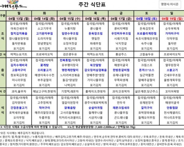 4월 둘째주 식단표 페이지 정보 작성자 은천노인복지회 작성일26-04-14 14:54 조회109회 댓글0건 관련링크 이전글 다음글 목록 답변 본문 4월 둘째주 어르신 식단표 안내해 드립니다. 정성과 영양을 담아 준비하겠습니다. 이전글 다음글 목록 답변