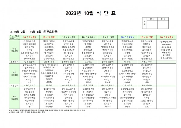 10월 첫째주 식단표 페이지 정보 작성자 은천노인복지회 작성일23-10-05 17:41 조회40,512회 댓글0건 관련링크 이전글 다음글 목록 답변 본문 . 이전글 다음글 목록 답변