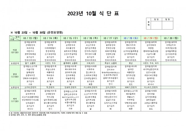 10월 넷째주 식단표 페이지 정보 작성자 은천노인복지회 작성일23-10-19 16:41 조회39,613회 댓글0건 관련링크 이전글 다음글 목록 답변 본문 . 이전글 다음글 목록 답변