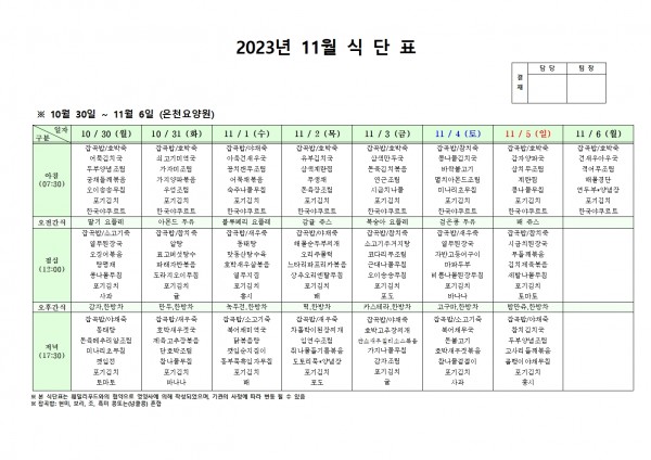 11월 첫째주 식단표 페이지 정보 작성자 은천노인복지회 작성일23-10-26 13:39 조회38,906회 댓글0건 관련링크 이전글 다음글 목록 답변 본문 . 이전글 다음글 목록 답변