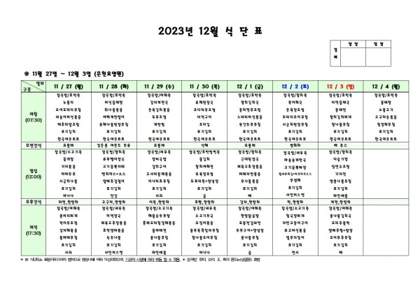 12월 첫째주 식단표 페이지 정보 작성자 은천노인복지회 작성일23-11-24 09:37 조회37,288회 댓글0건 관련링크 이전글 다음글 목록 답변 본문 . 이전글 다음글 목록 답변