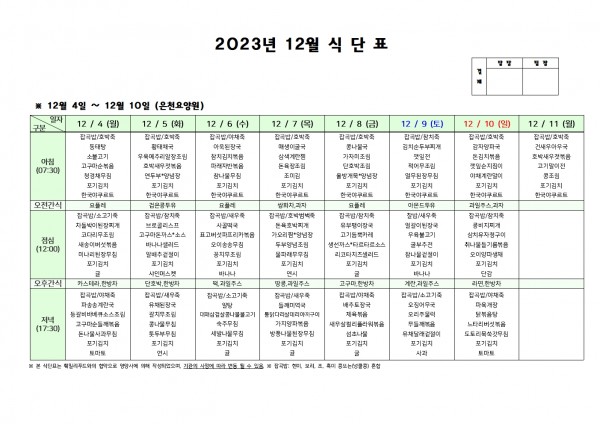 12월 둘째주 식단표 페이지 정보 작성자 은천노인복지회 작성일23-12-01 16:35 조회35,029회 댓글0건 관련링크 이전글 다음글 목록 답변 본문 . 이전글 다음글 목록 답변