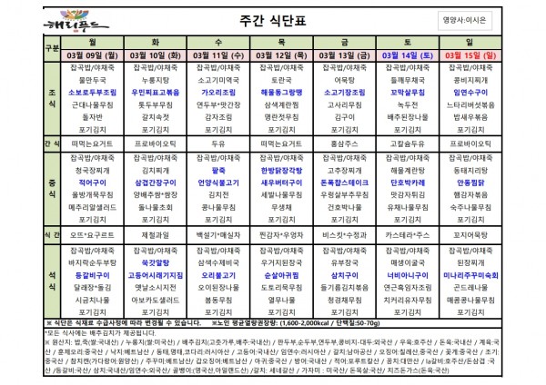 3월 둘째주 식단표 페이지 정보 작성자 은천노인복지회 작성일26-03-06 15:04 조회2,208회 댓글0건 관련링크 이전글 다음글 목록 답변 본문 3월 둘째주 어르신 식단표 안내해 드립니다. 정성과 영양을 담아 준비하겠습니다. 이전글 다음글 목록 답변