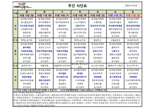 3월 셋째주 식단표 페이지 정보 작성자 은천노인복지회 작성일26-03-13 15:20 조회2,039회 댓글0건 관련링크 이전글 다음글 목록 답변 본문 3월 셋째주 어르신 식단표 안내해 드립니다. 정성과 영양을 담아 준비하겠습니다. 이전글 다음글 목록 답변