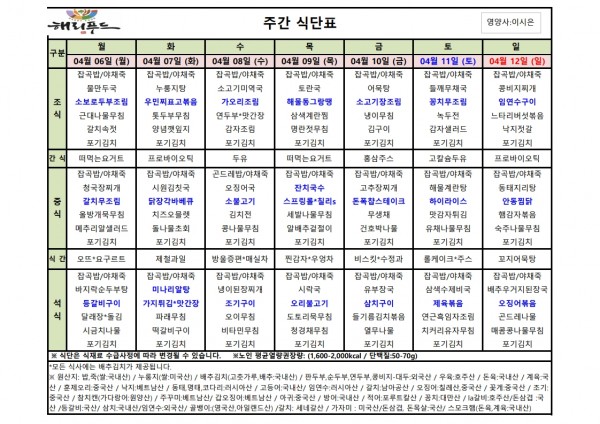 4월 첫째주 식단표 페이지 정보 작성자 은천노인복지회 작성일26-04-03 17:58 조회29회 댓글0건 관련링크 다음글 목록 답변 본문 4월 첫째주 어르신 식단표 안내해 드립니다. 정성과 영양을 담아 준비하겠습니다. 다음글 목록 답변