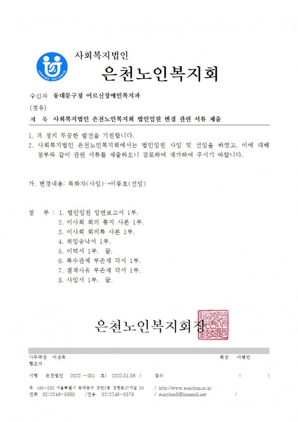사회복지법인 은천노인복지회 법인 임원 변경 페이지 정보 작성자 은천노인복지회 작성일22-01-06 13:54 조회29,603회 댓글0건 관련링크 목록 본문 사회복지법인 은천노인복지회 법인임원이 아래와 같이 변경되었습니다. 변경내용: 목화자(사임)->이동호(선임) 목록