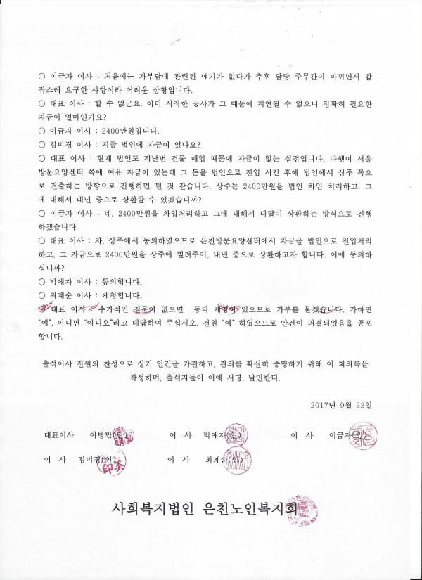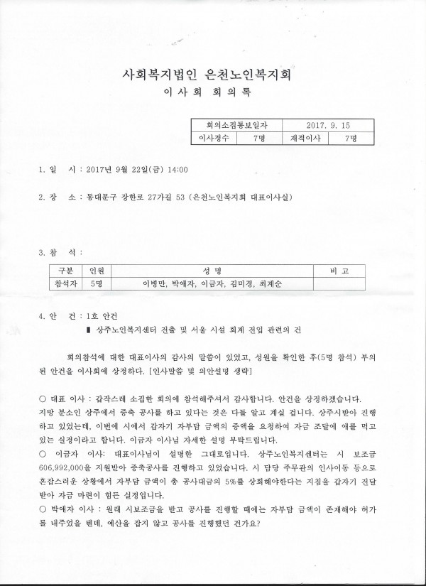 이사회의록 공개 페이지 정보 작성자 은천노인복지회 작성일17-10-16 14:27 조회36,991회 댓글0건 관련링크 목록 본문 9월 22일 상주노인복지센터 전출의 건 이사회의록을 공개합니다. 목록
