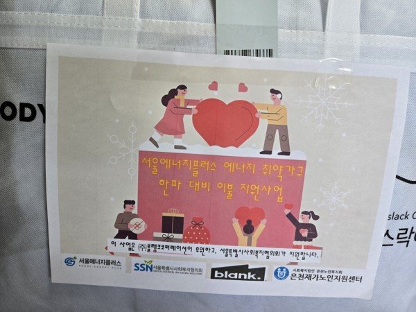 이번 겨울 은천재가노인지원센터에서는 (주)블랭크코퍼레이션이 후원하고, 서울특별시사회복지협의회가 지원하는 '서울에너지플러스 에너지 취약가구 한파 대비 이불 지원사업'으로 어르신들에게 따뜻한 이불을 전달 하였습니다.