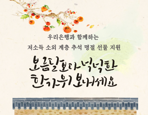 이번 추석 선물을 우리은행에서 지원받아 동대문구 저소득층 어르신들에게 지원해 드렸습니다.