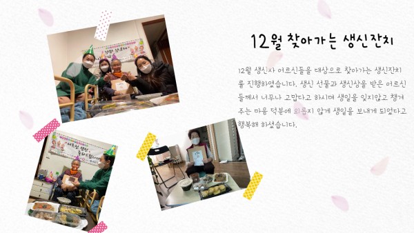 [재가노인지원서비스 ] 12월 찾아가는 생신잔치 페이지 정보 작성자 은천노인복지회 작성일21-12-31 13:32 조회20,573회 댓글0건 관련링크 이전글 다음글 목록 답변 본문 12월 찾아가는 생신잔치 이전글 다음글 목록 답변