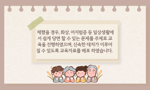 [재가노인서비스] 대상자교육_응급처치교육 페이지 정보 작성자 은천노인복지회 작성일22-03-03 11:43 조회19,738회 댓글0건 관련링크 이전글 다음글 목록 답변 본문 은천재가노인지원센터 대상자 어르신들에게 응급처치교육을 진행하였습니다. 이전글 다음글 목록 답변
