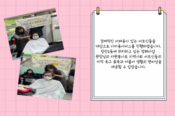 [재가노인지원서비스] 이미용 서비스 페이지 정보 작성자 은천노인복지회 작성일22-03-30 14:02 조회19,128회 댓글0건 관련링크 이전글 다음글 목록 답변 본문 3월 이미용 서비스 이전글 다음글 목록 답변