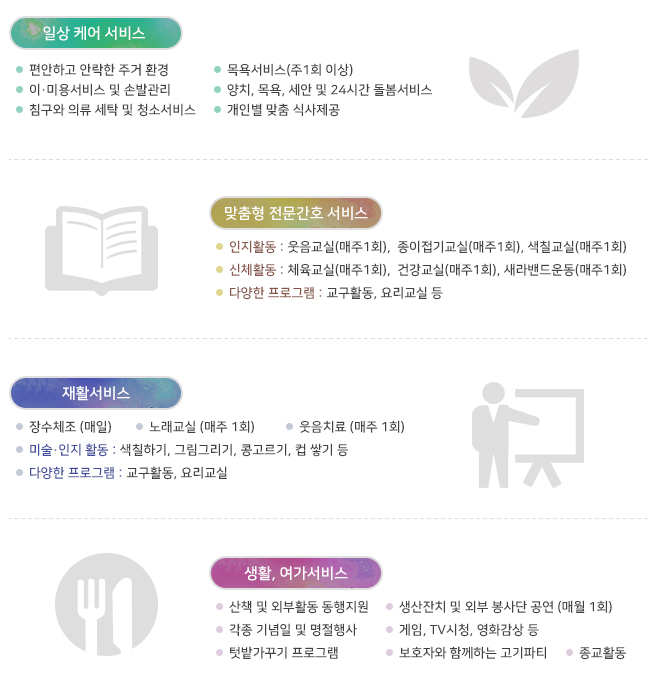 • 입소대상자의 삶의 질을 높이기 위한 최적의 요양서비스를 제공하기 위하여 개인적 특성을 고려한 체계적인 관리를 하고,